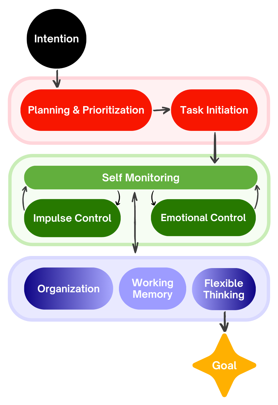 Once that’s done, only then is it useful to focus on strategies for breaking tasks down into simpler versions of themselves, finding tools and contexts for improving focus and accountability, and generally working up and down that colorful flowchart up there to improve whatever part of executive function might be rate limiting. For example, since past difficulties can exacerbate this sense of predicted suffering or failure, it’s also important to focus on small, achievable steps that are more likely to succeed and thus increase predictability of success.
