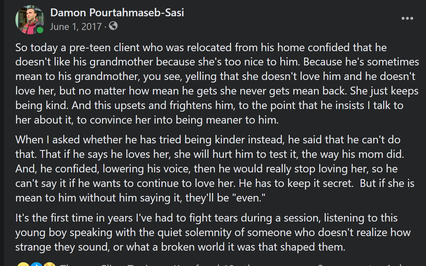 The second flag is for when someone is sharing vulnerability with me in a way that makes them obviously distressed. At first this happened involuntarily, and it was like I had a new set of mirror neurons that activated automatically whenever someone around me was feeling deeply sad or lost. Now it feels more like something I notice and can choose to have happen. This does mean I sometimes miss the opportunity to do it, but it also means that it has yet to cause any debilitation when someone explicitly comes to me for help.