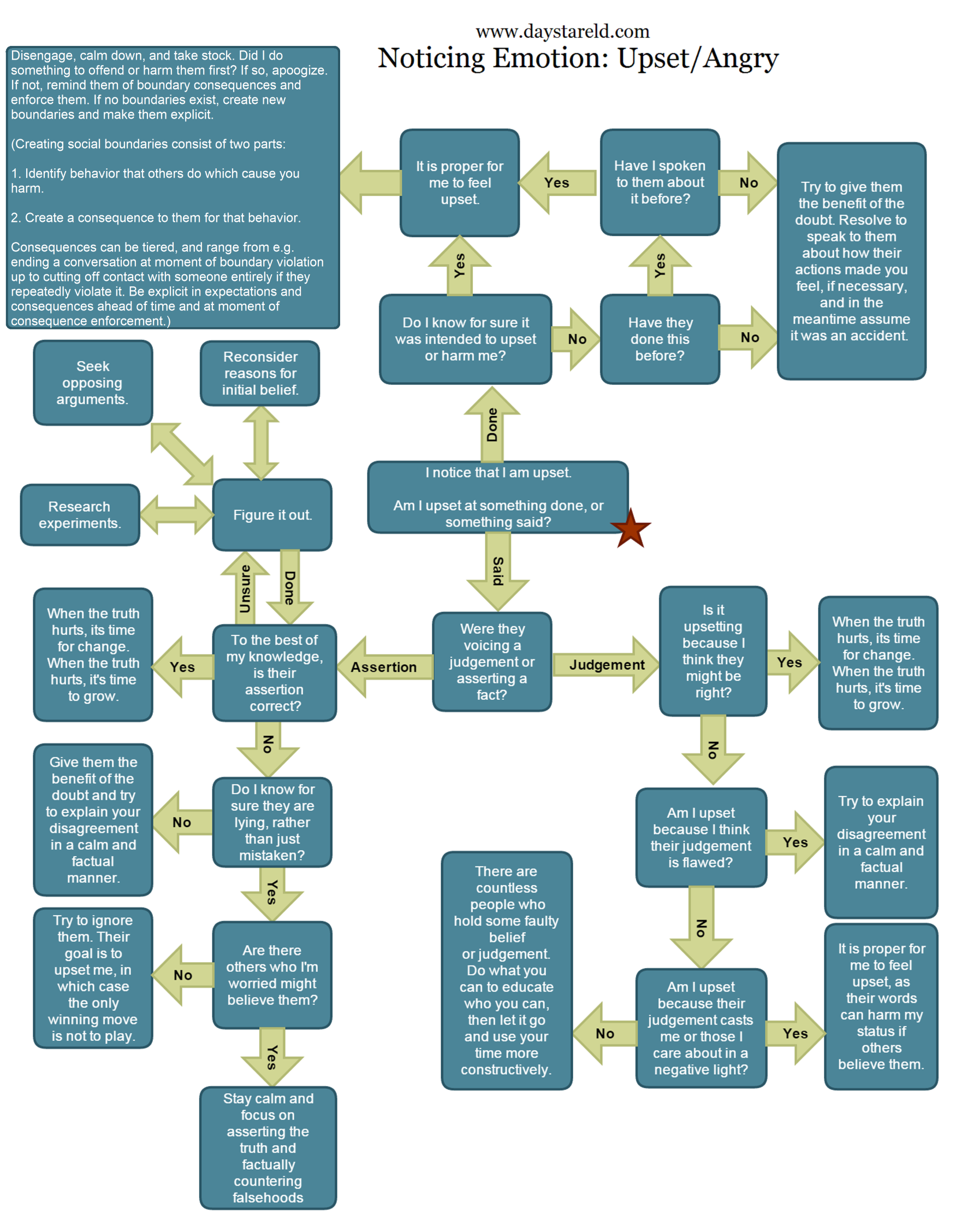 In Chapter 20 of The Origin of Species, Red uses a mental flowchart to identify why he's so upset at something Psychic Narud said to him. People have asked what it's from, so here is a rough draft of that flowchart in its entirety. I came up with it as a way to help clients improve awareness of what upsets them and work through why, and you're welcome to use it as you will. (You may need to "open image in new tab" to read it.)